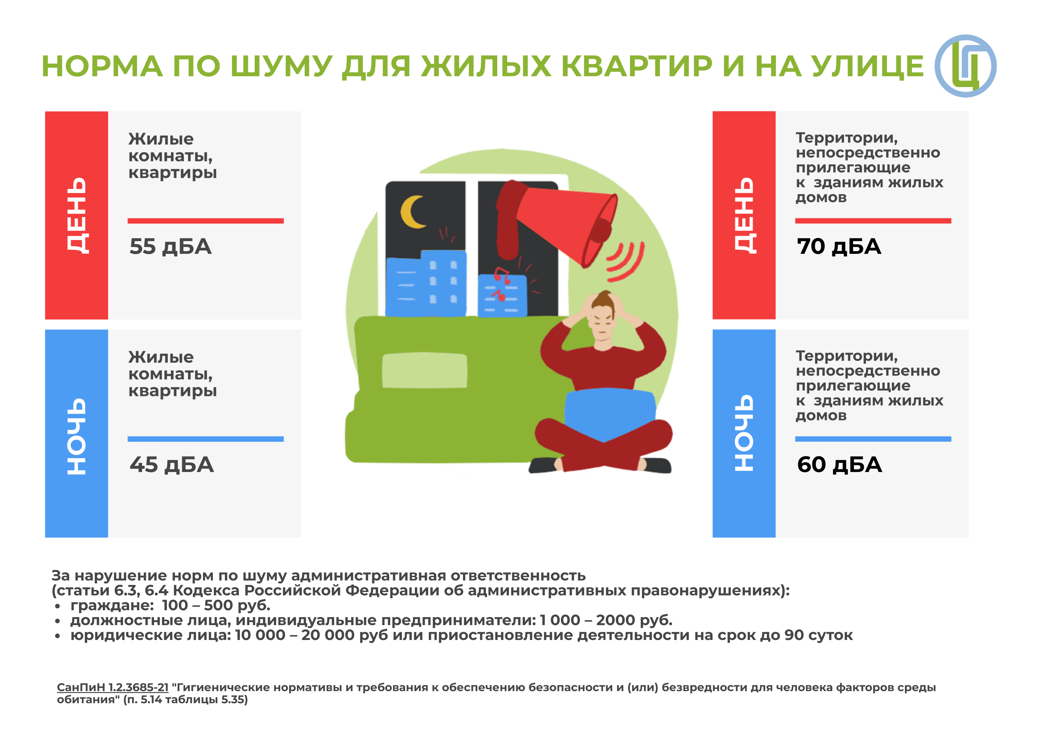 Санитарно-эпидемиологическим  законодательством установлены нормируемые параметры уровней  шума в помещениях жилых и общественных зданий и  на  селитебной территории (СанПиН 1.2.3685-21 «Гигиенические нормативы и требования к обеспечению безопасности и (или) безвредности для человека факторов среды обитания»).  С 07:00 утра до 23:00 максимальный уровень шума в квартирах должен ограничиваться  55  децибелами, а в ночные часы (с 23.00 до 07.00) – не превышать 45 децибел.